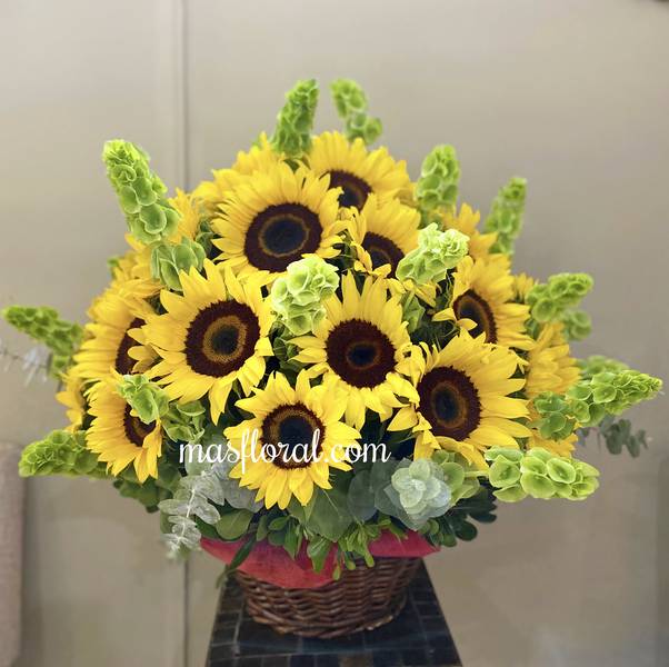 Hermoso arreglo de 5 girasoles, 4 gerberas y 10 rosas en base de acero inoxidable con texto en vinil