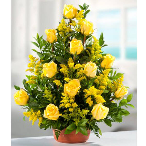 Hermoso arreglo en base de cerámica con rosas, girasoles, Lilis, liatrix y follajes finos
